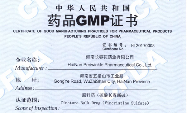 API Vincristine Sulfate has obtained the "GMP" certificate of CFDA on January 9, 2017. API Vinblastine Sulfate, Vindesine Sulfate, Vinorelbine Tartratehave meet the standards of USP,EP,BP&JP.