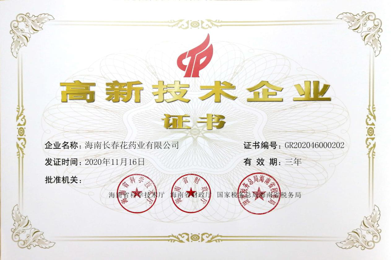 熱烈祝賀海南長春花藥業(yè)有限公司獲得高新技術(shù)企業(yè)證書